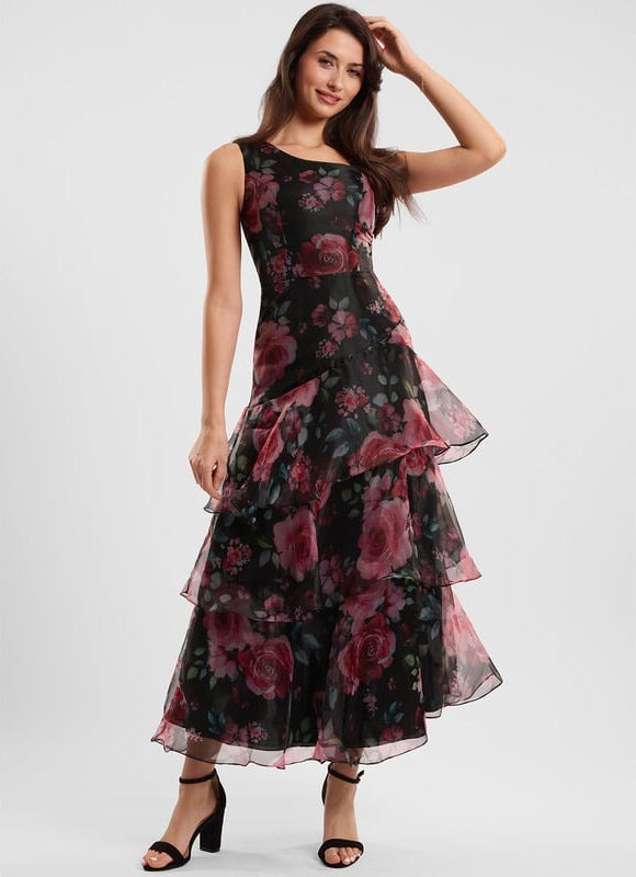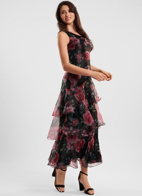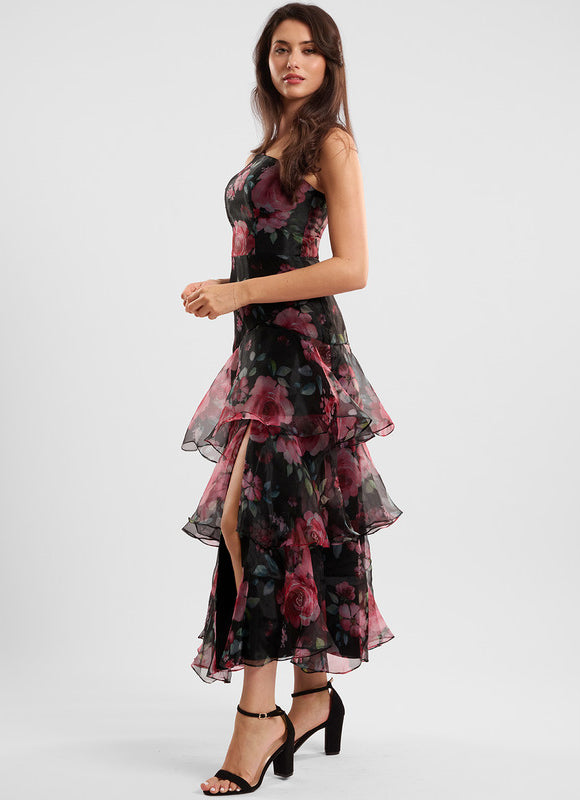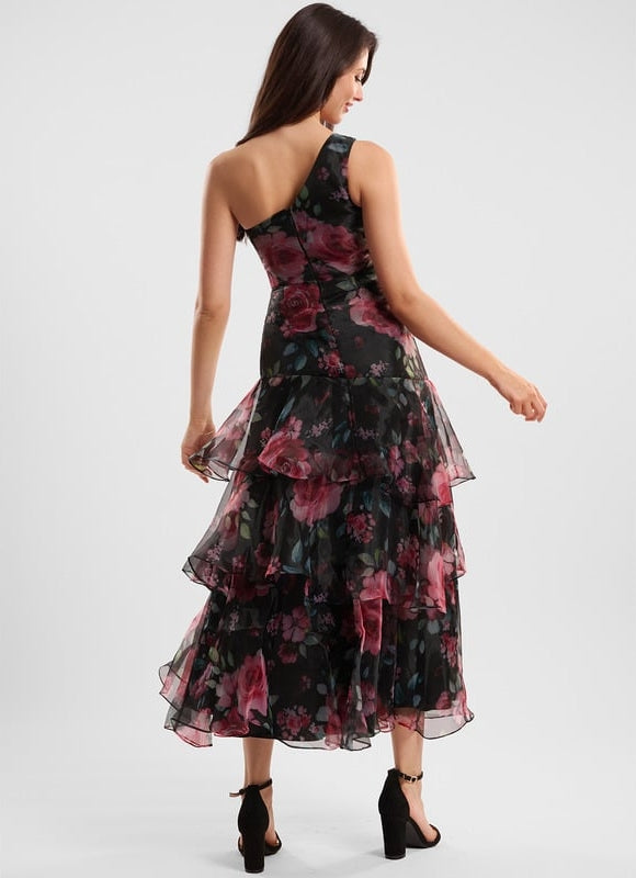 Chaque détail de cette robe a été pensé pour créer un impact visuel fort. Son décolleté asymétrique audacieux révèle une épaule avec élégance, apportant une touche de modernité et de sensualité. L'imprimé floral éclatant, avec ses roses luxuriantes sur un fond sombre, évoque la beauté d'un jardin secret et ajoute une profondeur visuelle captivante. La forme trapèze fluide, agrémentée de volants aériens sur la jupe, danse avec chacun de vos pas, créant un mouvement gracieux et envoûtant. Et pour couronner le tout, une fente haute discrète apporte une touche d'audace et de légèreté, sublimant vos jambes avec subtilité.