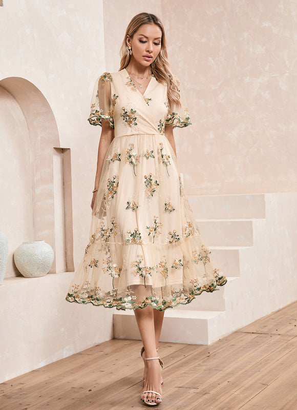 Chaque élément de cette robe a été pensé pour vous offrir une expérience unique. Le tissu principal en dentelle, d'une douceur incomparable, est sublimé par des broderies florales exquises qui ajoutent une dimension artistique et un relief visuel saisissant. Sa coupe trapèze fluide est universellement flatteuse, épousant délicatement votre silhouette sans la contraindre, offrant une liberté de mouvement et un confort absolu. Le col V élégant met en valeur votre décolleté avec subtilité, tandis que la longueur midi apporte une touche de sophistication et de polyvalence, parfaite pour diverses occasions. La robe est entièrement doublée pour assurer confort et opacité, vous permettant de vous sentir à l'aise et en sécurité.Caractéristiques Clés de votre future Robe Trapèze Florale Chic