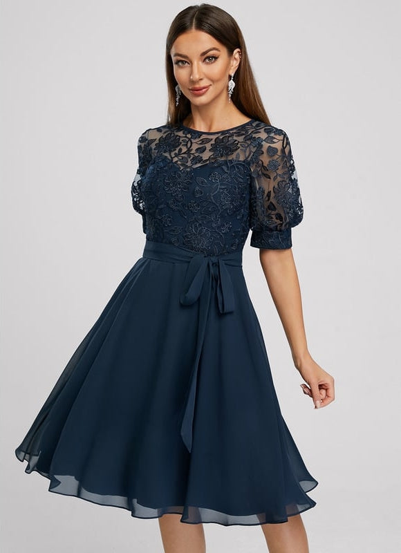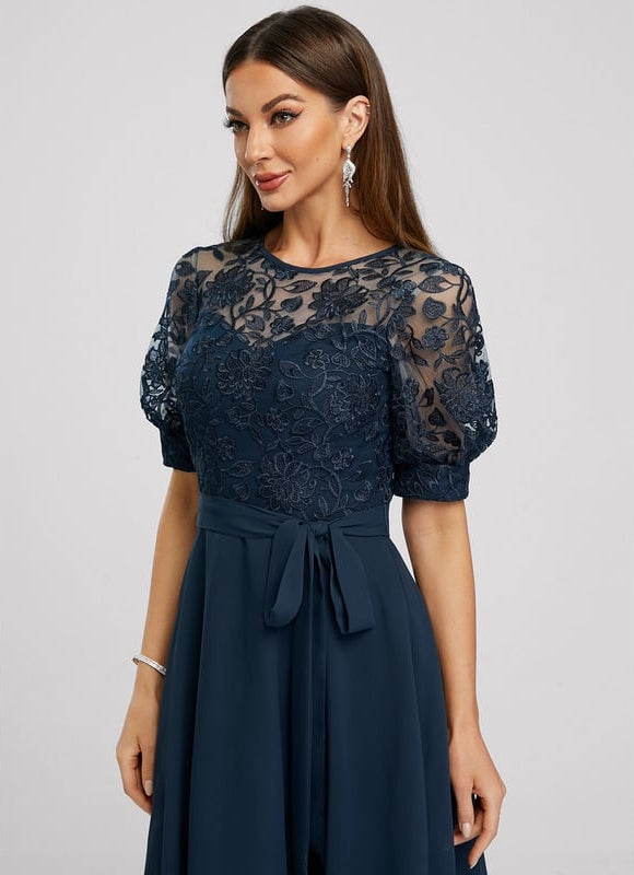 Chaque aspect de cette robe a été pensé pour sublimer votre silhouette et enrichir votre présence. Le tissu en mousseline, léger et aérien, offre un tombé parfait et un mouvement fluide à chaque pas, vous permettant de danser et de vous déplacer avec une légèreté envoûtante. Le haut de la robe est orné de détails décoratifs floraux en dentelle brodée, créant un contraste sublime avec la teinte unie de la jupe et ajoutant une dimension de raffinement et de féminité. Les manches courtes bouffantes, de style midi, apportent une touche de romantisme et d'originalité. La forme trapèze, intemporelle et universellement flatteuse, assure un confort optimal tout en dessinant une silhouette élégante sans contraintes. Le col rond classique et le dos arrondi avec une subtile ouverture en goutte d'eau complètent ce design avec une note de délicatesse et de modernité. Une ceinture à nouer, assortie, permet de souligner délicatement votre taille, créant ainsi une silhouette équilibrée et harmonieuse.
