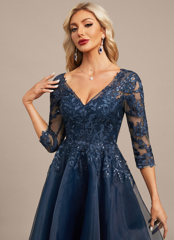 Chaque détail de cette robe a été pensé pour sublimer votre silhouette et vous offrir une expérience inoubliable. Le corsage en dentelle, richement brodé et orné de paillettes, capture la lumière et attire l'œil, créant un effet "nuit étoilée" absolument spectaculaire. Les manches trois-quarts semi-transparentes ajoutent une touche de raffinement et de légèreté. La coupe trapèze, avec sa jupe asymétrique et flottante, assure une liberté de mouvement et une allure gracieuse, sans jamais restreindre. Vous apprécierez la doublure complète qui garantit opacité et confort, ainsi que le soutien-gorge intégré qui offre un maintien parfait sans nécessiter de sous-vêtements supplémentaires. Le dos en V apporte une touche finale d'élégance, dévoilant subtilement votre peau pour un look sophistiqué et harmonieux. Sans fente sur la jambe, la robe conserve une allure classique et intemporelle.