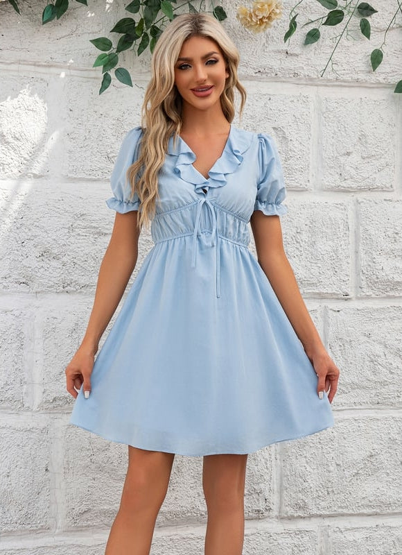 - Style : Forme trapèze flatteuse avec des détails à volants et un col V élégant.