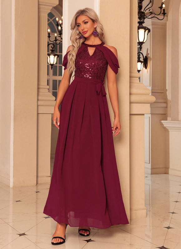 Préparez-vous à captiver tous les regards avec notre sublime Robe Trapèze Velours Aquarelle, la pièce maîtresse de votre garde-robe estivale. Cette robe longue, confectionnée dans une mousseline légère et fluide, est l'incarnation même de l'élégance et du confort. Son décolleté épaules audacieux et son bustier richement orné de sequins créent un contraste saisissant, évoquant une profondeur et une brillance qui rappellent les nuances d'une aquarelle vibrante sur du velours. La coupe trapèze flatte magnifiquement toutes les silhouettes, offrant une aisance parfaite pour danser toute la nuit ou flâner lors d'une chaude soirée d'été. Avec sa ceinture assortie qui souligne délicatement votre taille, cette robe est conçue pour celles qui désirent allier sophistication et légèreté.